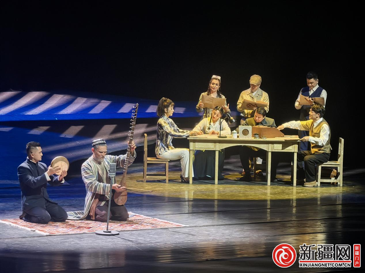 歌劇《木卡姆戀歌——萬桐書》中萬桐書與隊員為吐爾迪·阿洪記錄他用薩塔爾琴彈奏的樂曲。(薛玲攝)